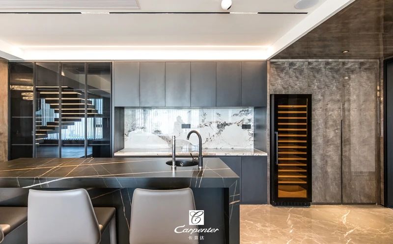 餐廳相鄰而設(shè)的吧臺(tái)兼具島臺(tái)功能